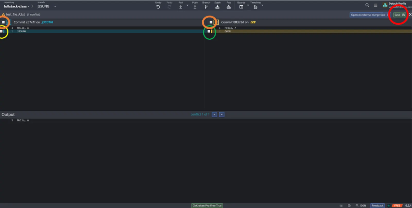 충돌 문제를 다 해결하고 나서 Save 버튼을 누르면 직접 충돌 해결을 한 부분들이 원하는대로 고쳐집니다.
