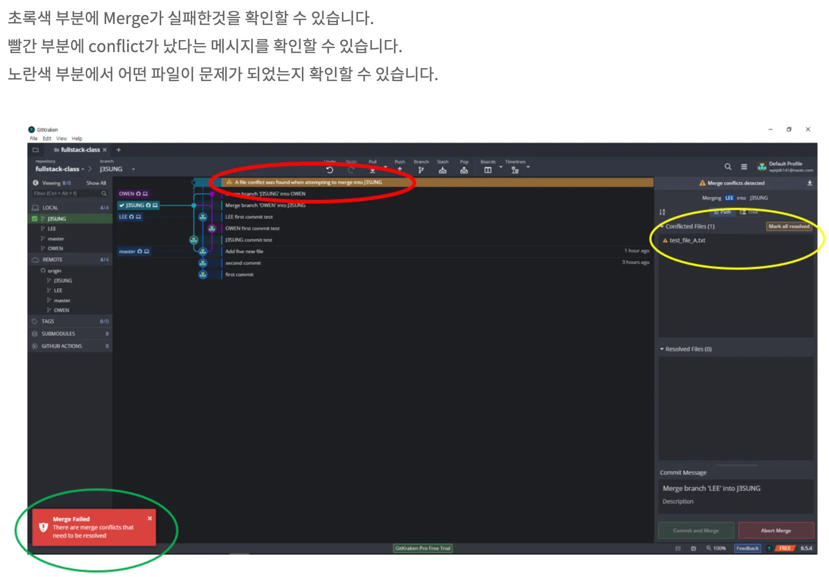 문제가 있다면 화면에 머지가 실패했다는 문구와 함께 노란 컴플릭트 메시지가 뜹니다.