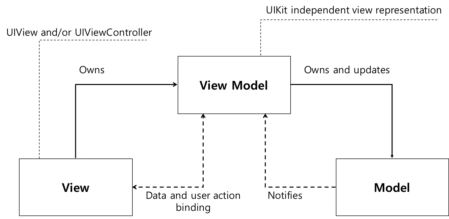 한 가지 눈에 띄게 바뀐 부분이 있다면 View Model 입니다. Controller가 View Model로 바뀌었습니다. MVVM은 MVC와 유사하지만 ViewController의 역할이 최소화됩니다. MVC에서는 ViewController의 역할이 컸습니다. Controller로서 일을 해야 했기 때문이죠.