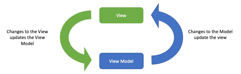 MVVM에서도 View는 Update된 모델로부터 온 데이터를 표시하는 일을 합니다. Controller, Presenter가 모델을 업데이트하고 View에게 업데이트된 모델을 전달해줬듯이, MVVM에서는 그 일을 View Model이 맡아서 진행합니다.