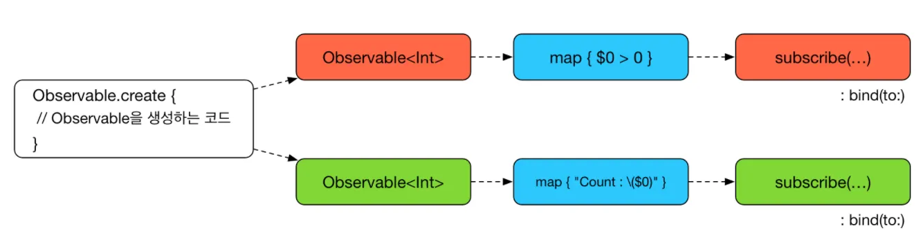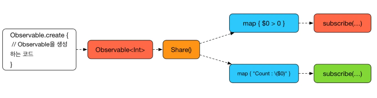 Observable์ shareํ์ง ์์ผ๋ฉด subscribeํ ๋๋ง๋ค ์๋ก์ด Observable ์ํ์ค๊ฐ ์์ฑ๋ฉ๋๋ค.