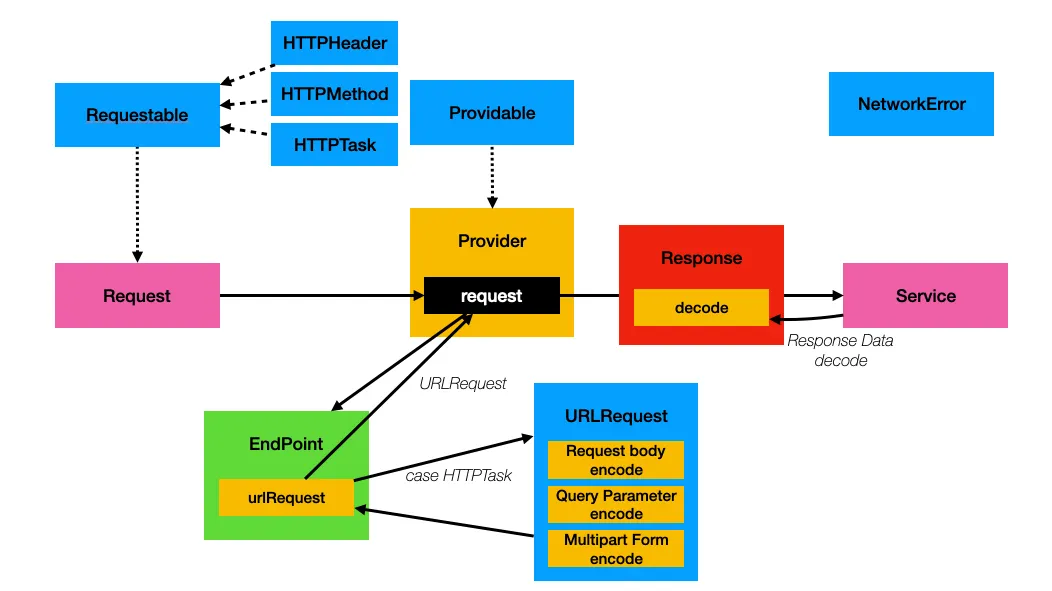 HTTPMethod, HTTPHeaders, HTTPTask 입니다. HTTPHeaders는 Alamofire에 있는 HTTPHeaders 타입을 참고했습니다. HTTPTask는 Moya에 있는 Task 타입을 참고했습니다.