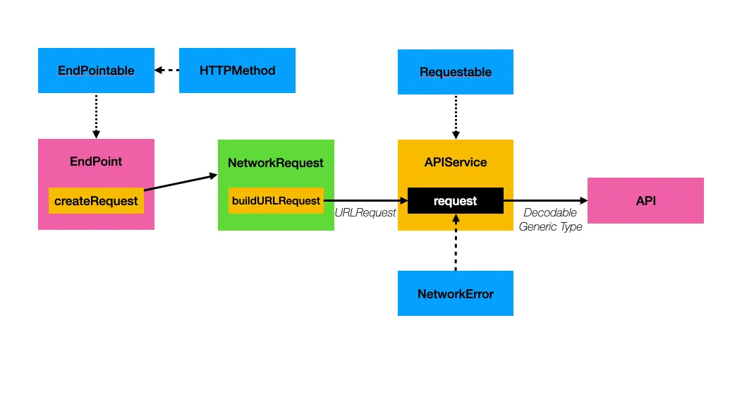 EndPoint는 Requestable를 준수하는 타입을 URLRequest 타입으로 만들기 전에 한 번 더 감싸주는 역할 합니다. EndPoint 내부에 있는 urlRequest 메서드를 사용해서 URLRequest 타입으로 EndPoint를 변환합니다.