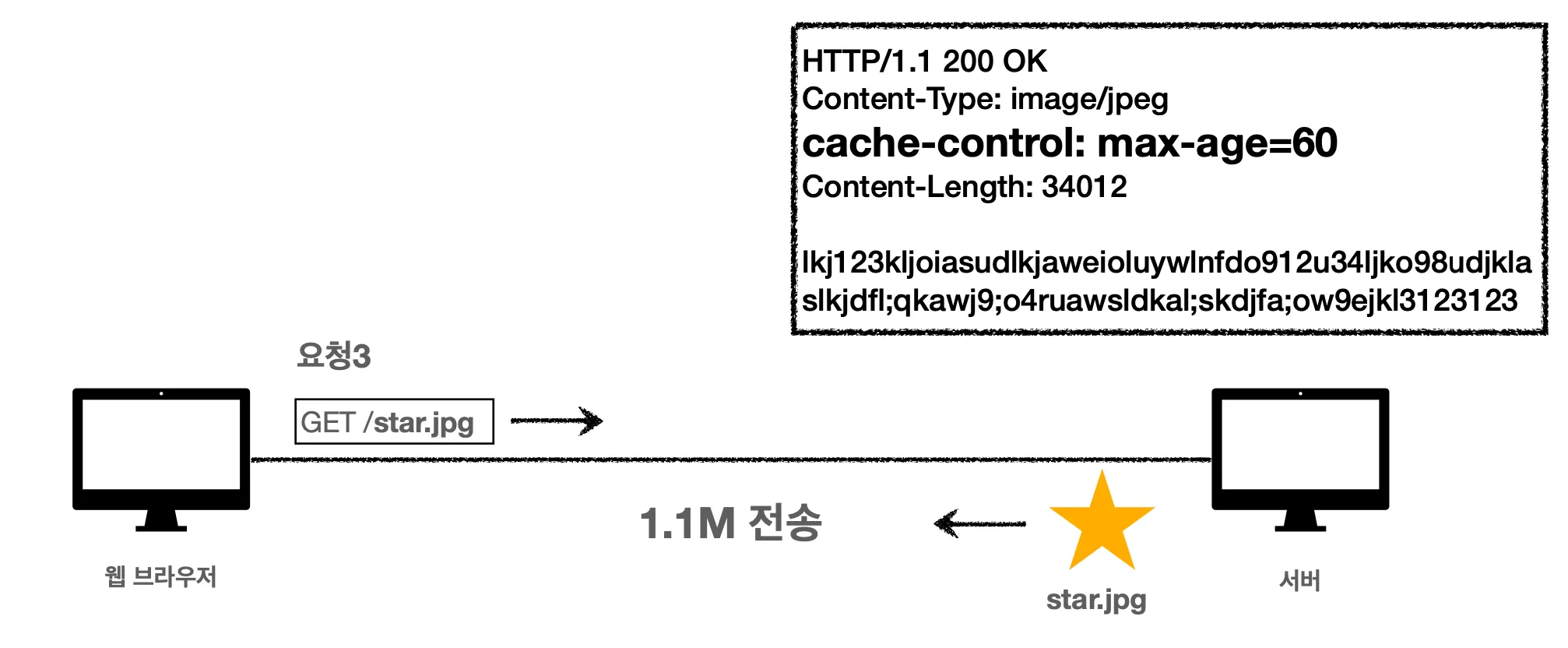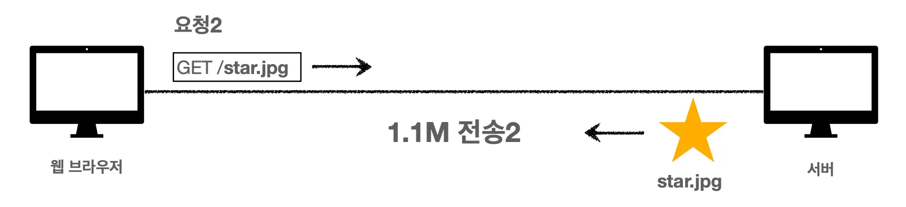 위의 상황과 동일하게 이미지를 받아옵니다. 웹 브라우저는 star.jpg 이미지를 서버에 요청하고 서버는 이전과 동일하게 헤더, 바디를 구성해서 웹 브라우저로 내려줍니다.