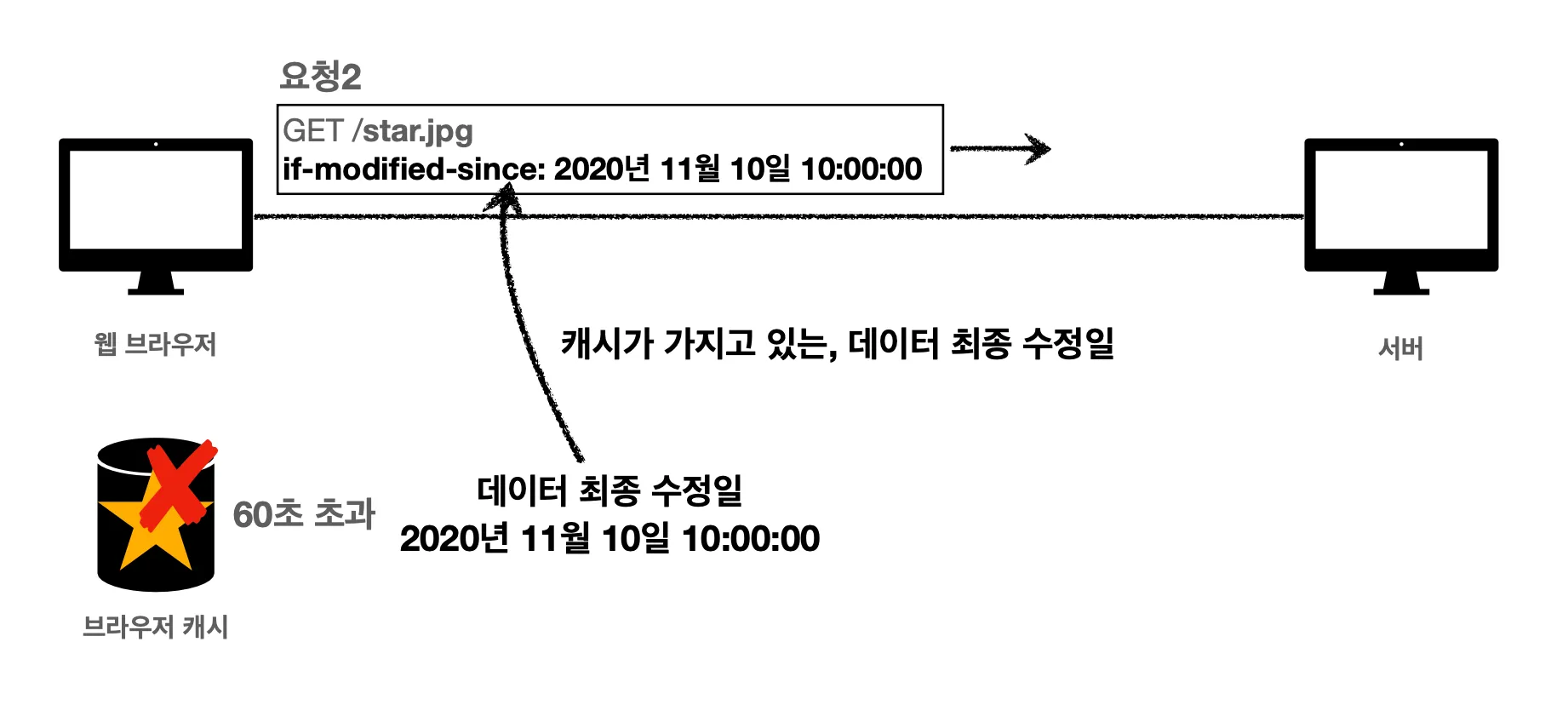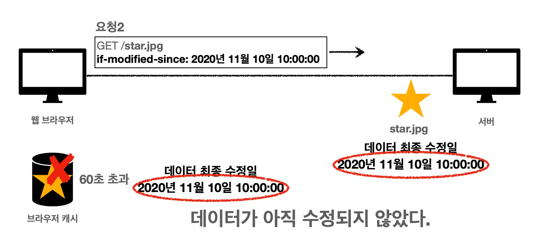 서버는 클라이언트가 보낸 요청을 받고, if-modified-since 헤더 필드가 있다는 걸 확인합니다. 그리고 서버가 가지고 있는 star.jpg 데이터의 최종 수정일과 비교합니다. 날짜를 사용해서 판단하고 날짜 데이터가 동일하다면 해당 캐시를 그대로 사용해도 된다고 판단합니다.