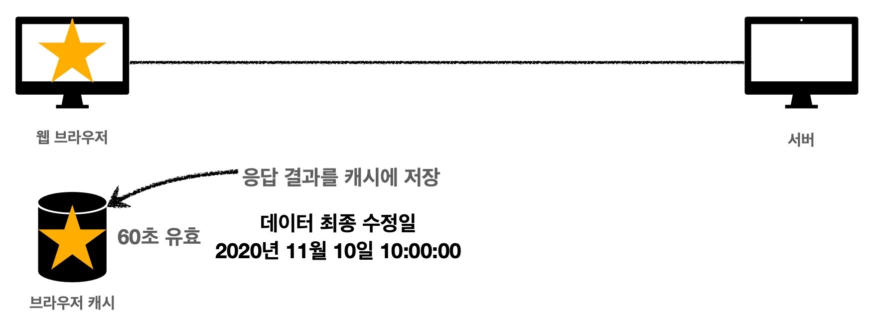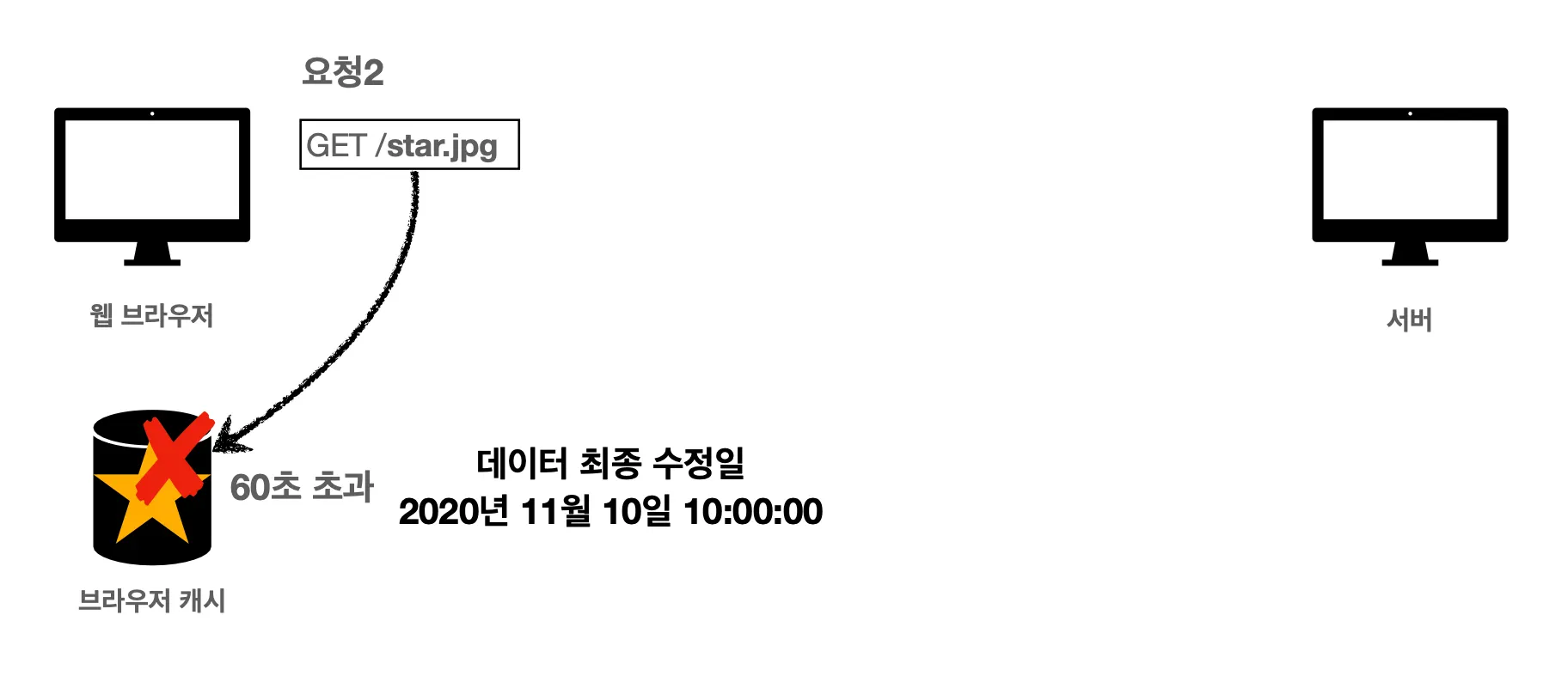 첫 번째 상황은 서버가 데이터를 노란색 별에서 초록색 별로 변경한 겁니다. 데이터가 변경되었기 때문에 캐시 저장소에 있는 데이터는 신선하지 못한 데이터라서 새로운 데이터를 다운로드 받아서 다시 캐시를 갱신해주어야 합니다.