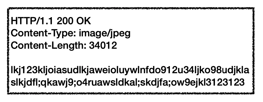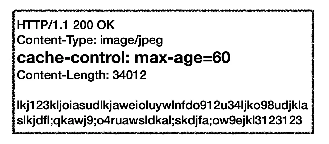 그렇다면, 클라이언트는 이미지를 웹 브라우저에 띄워주기 위해서 서버에 이미지를 보내달라고 요청을 해야 합니다. 다시 요청을 하면 서버에서 이전과 동일하게 헤더와 바디를 구성하고 응답 메시지를 내려줍니다. 이전과 동일하게 cache-control 헤더 필드도 포함해줍니다.