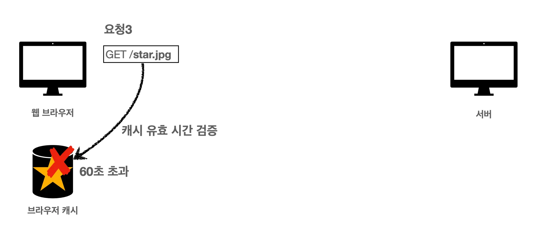 이번에도 클라이언트는 이미지를 가져오려고 합니다. 클라이언트는 먼저 캐시 저장소를 뒤집니다. 근데 이번에는 캐시 시간이 초과되었습니다. 이전에 서버에서 응답 메시지를 보낼 때 해당 캐시를 60초만 사용할 수 있도록 했기 때문에 클라이언트는 더이상 해당 캐시를 사용할 수 없습니다.