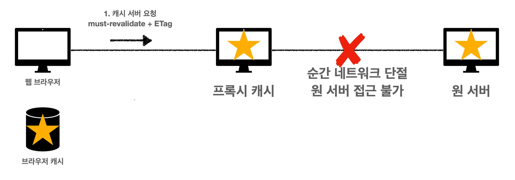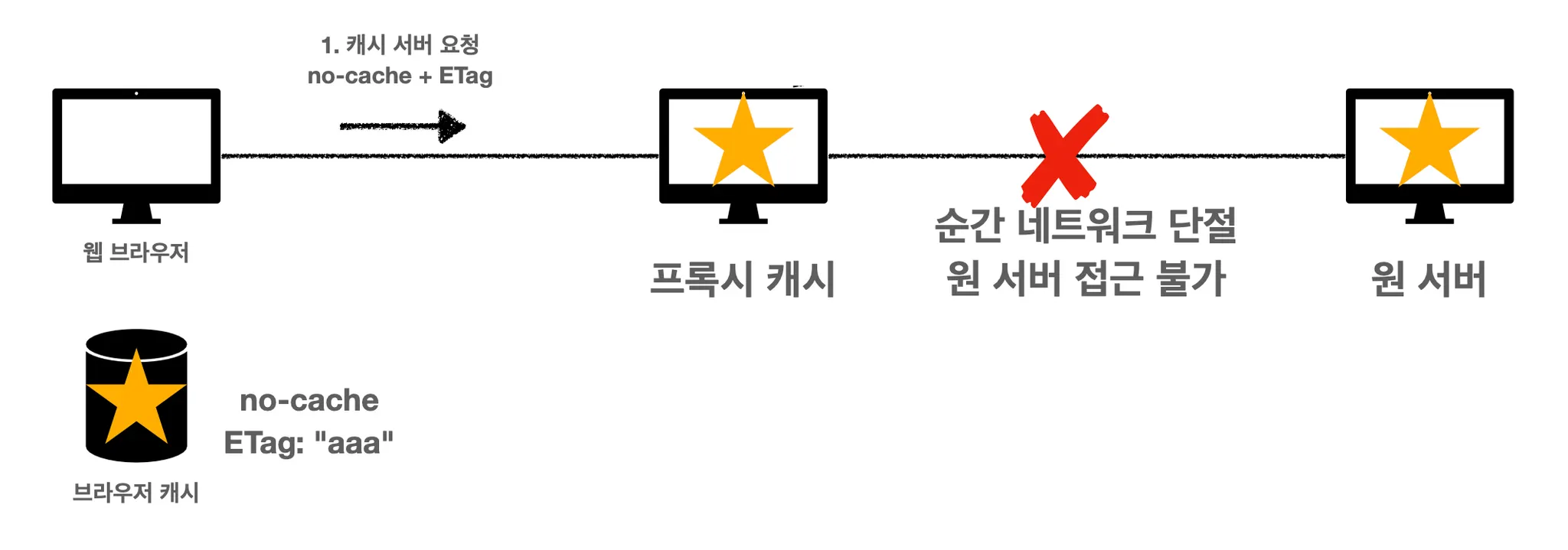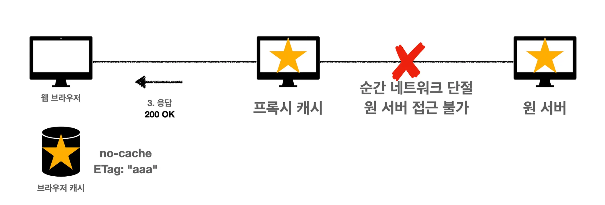 no-cache 를 사용하면 이런 식으로 클라이언트와 서버가 통신하게 됩니다. 하지만 프록시 캐시와 원 서버 사이에서 문제가 발생했을 경우에 no-cache 사용 흐름에서도 문제가 생깁니다.