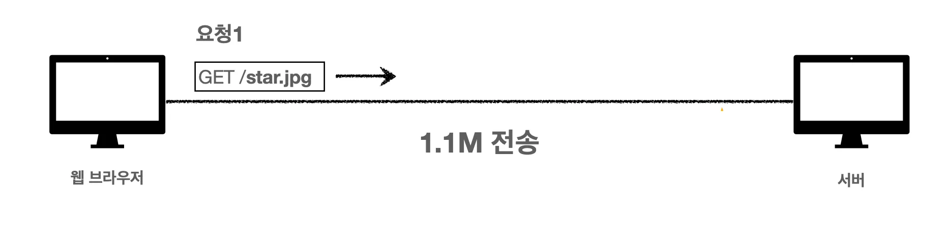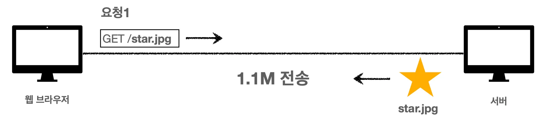 웹 브라우저에서 star.jpg 이미지를 요청해서 서버로부터 받아온다고 해봅시다. 웹 브라우저는 이미지를 요청하고 서버는 요청 메시지를 확인한 후에 star.jpg 이미지를 내려줄 겁니다.