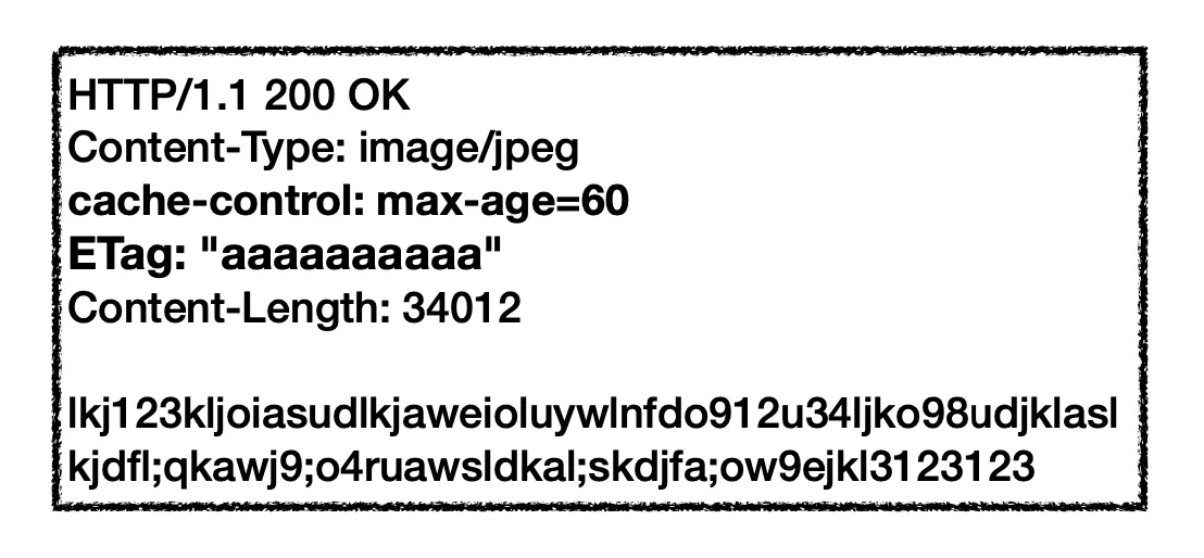 이전처럼 서버로부터 이미지를 받아온다고 합시다. 서버는 요청을 받아서 이미지를 내려줄 때, ETag 검증 헤더를 포함해서 내려줍니다.