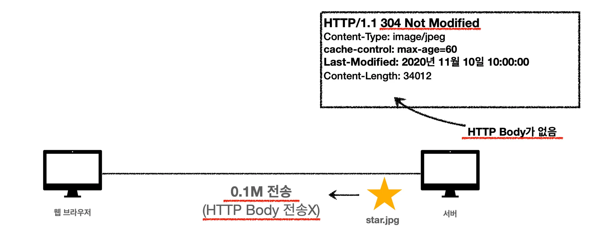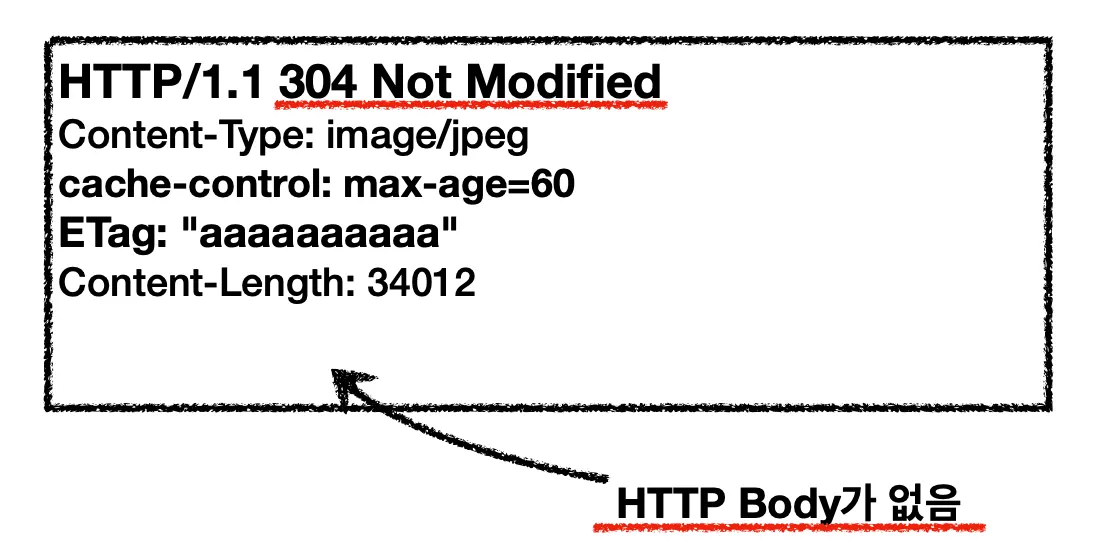 서버는 304 Not Modified 상태 코드와 함께 HTTP 바디없이 헤더만 클라이언트에게 내려줍니다. 수정된 부분이 없기 때문에 굳이 HTTP 바디를 포함할 필요가 없는 것이죠. 따라서, 시작 라인과 헤더만을 포함해서 응답 메시지를 클라이언트로 보내줍니다. 원래는 HTTP 바디까지 포함해서 총 1.1M의 응답 메시지가 클라이언트로 내려갔지만 헤더 부분만 전송함으로써 0.1M만 클라이언트로 전송되게 됩니다. 네트워크 부하가 확 줄어드는 겁니다.