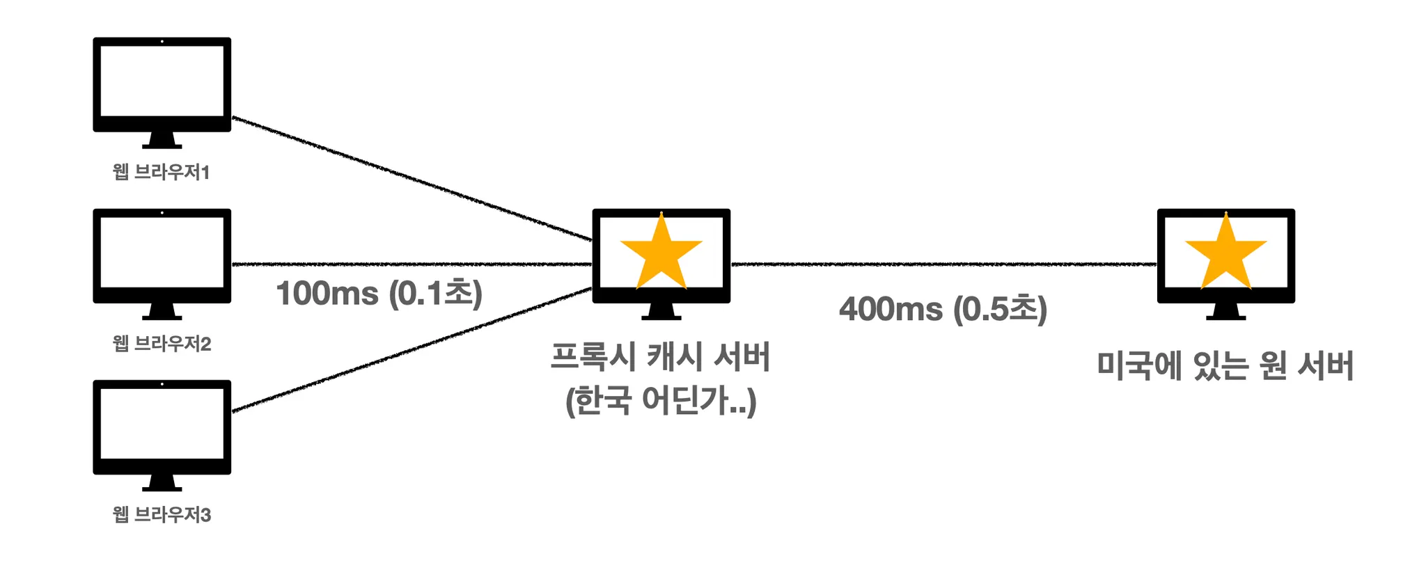 프록시 캐시 서버는 응답 시간이 빠르기 때문에 이전에는 0.5초가 걸렸던 응답을 0.1초만에 해줍니다.