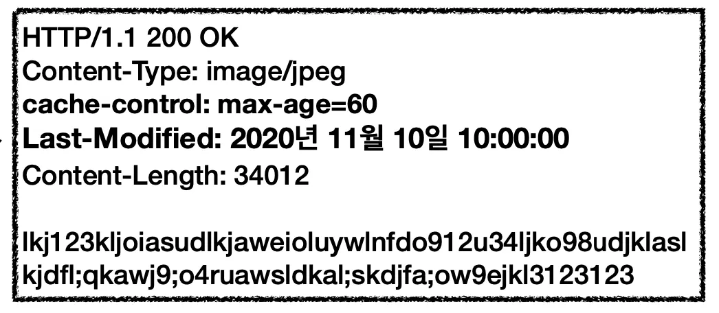 웹 브라우저가 서버에게 이미지를 요청했을 때, 서버는 캐시에 대한 정보를 설정해서 헤더와 바디를 내려줍니다. 이때 cache-control 헤더 필드와 함께 Last-Modified 헤더 필드를 추가로 보내줍니다.