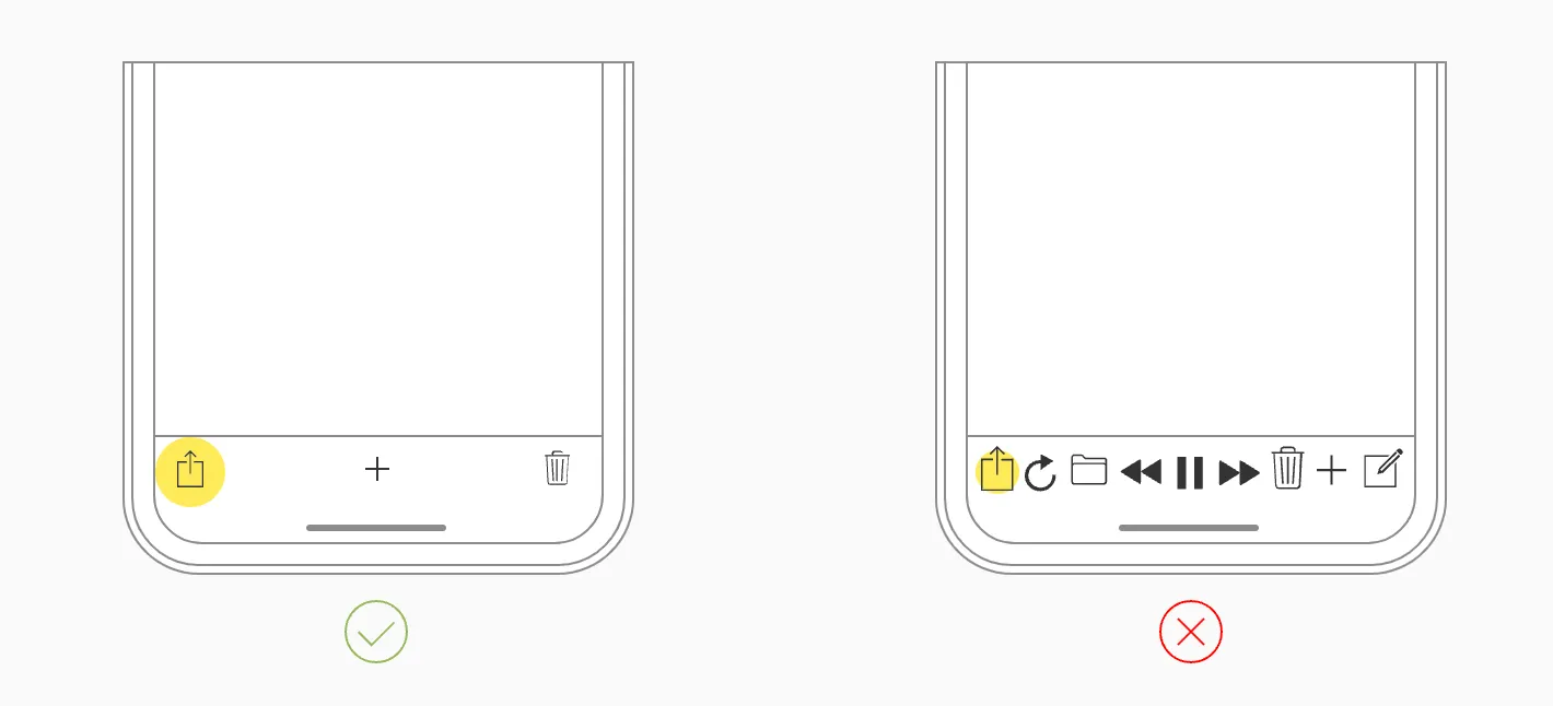 사용자들은 화면의 아래서 위로 스와이프하는 제스처를 사용해 홈스크린으로 나가거나 앱을 전환합니다. 이 제스처가 일어나는 부분에 커스텀된 제스처를 만들면 방해받을 수 있습니다. 또 화면의 먼 모퉁이는 사용자들이 편하게 누르기 어렵죠.