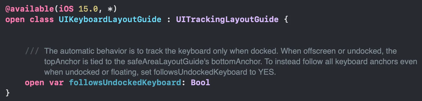 iOS 15 이상에서는 키보드가 차지하는 공간과 안전 영역을 나타내는 키보드 레이아웃 가이드를 정의합니다. 이 가이드를 사용하면 사용자가 사용하는 키보드 유형이나 위치에 관계없이 키보드가 앱의 필수 구성 부분으로 느껴지도록 할 수 있습니다.