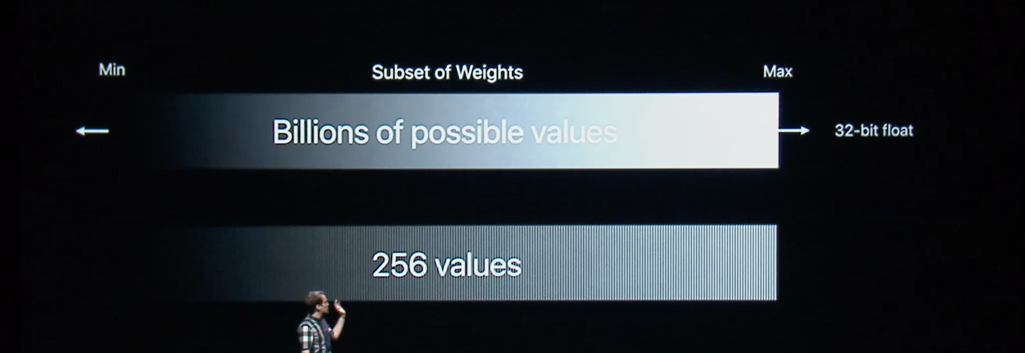 이제 이 작은 세트에서 가중치를 뺄 수 있기 때문에 Core ML은 가중치에 대한 저장된 정보가 8비트만 있으면 됩니다.