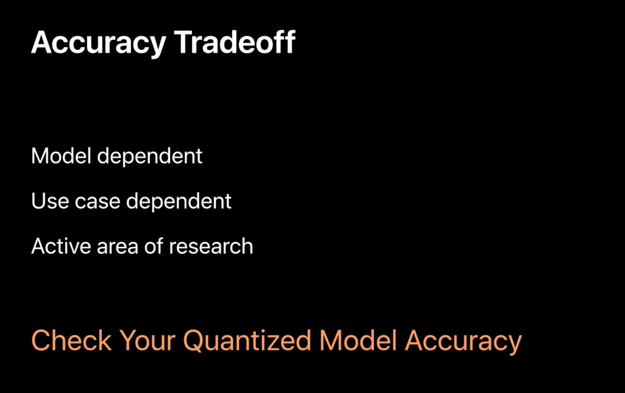항상 정량화된 모델의 정확성을 확인하고 참조된 부동소수점 버전과 비교하여 앱 및 사용 사례에 적합한 관련 데이터 및 폼 메트릭스를 제공하는 것이 좋습니다.
