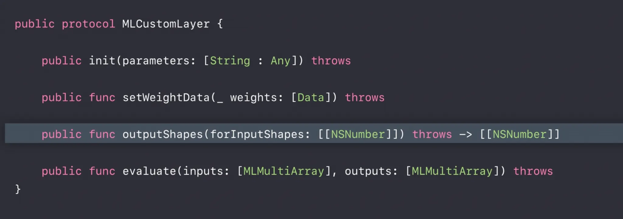 모델 내에서 사용자 지정 계층은 구현 클래스의 이름인 AAP Custom을 저장합니다.이 경우에는 AAP Custom은 말 레이어입니다. 구현 클래스는 추론 엔진에서 누락된 구현의 역할을 채웁니다. 계층이 Core ML에 내장되어 있는 것처럼, 여기서 제공되는 구현은 일반적이며 새로운 계층의 모든 인스턴스에 적용 가능해야 합니다.