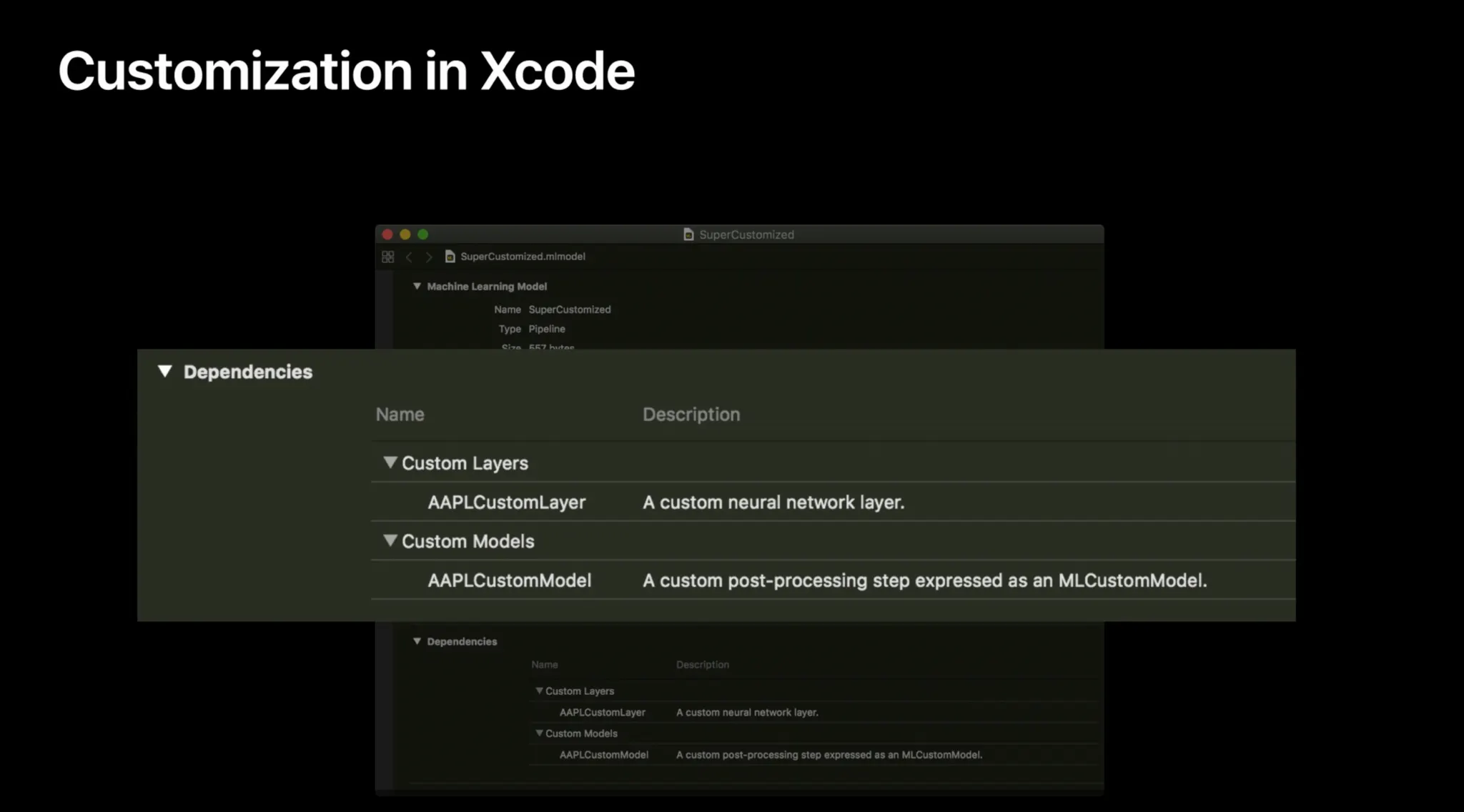 당신의 앱에서 사용자 정의 모델을 사용하는 것은 다른 Core ML 모델과 대체로 동일한 워크플로우입니다. Xcode에서 사용자 정의된 구성 요소가 있는 모델에는 간단한 설명과 함께 필요한 구현의 이름을 나열하는 종속성 섹션이 있습니다. 앱에 이것들을 포함하기만 하면, Core ML를 사용할 준비 완료 입니다!