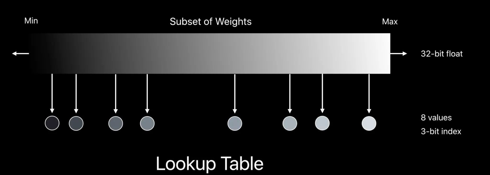 예를 들어, 우리는 네트워크가 56개의 다른 값들 중 하나 대신에, 8개의 값을 취하도록 제한할 수 있어요. 이제 8가지 옵션만 있으므로 모델을 저장하려면 Core ML의 무게당 3비트 값이 필요합니다.