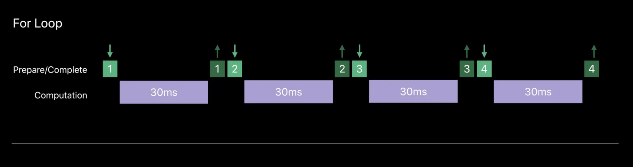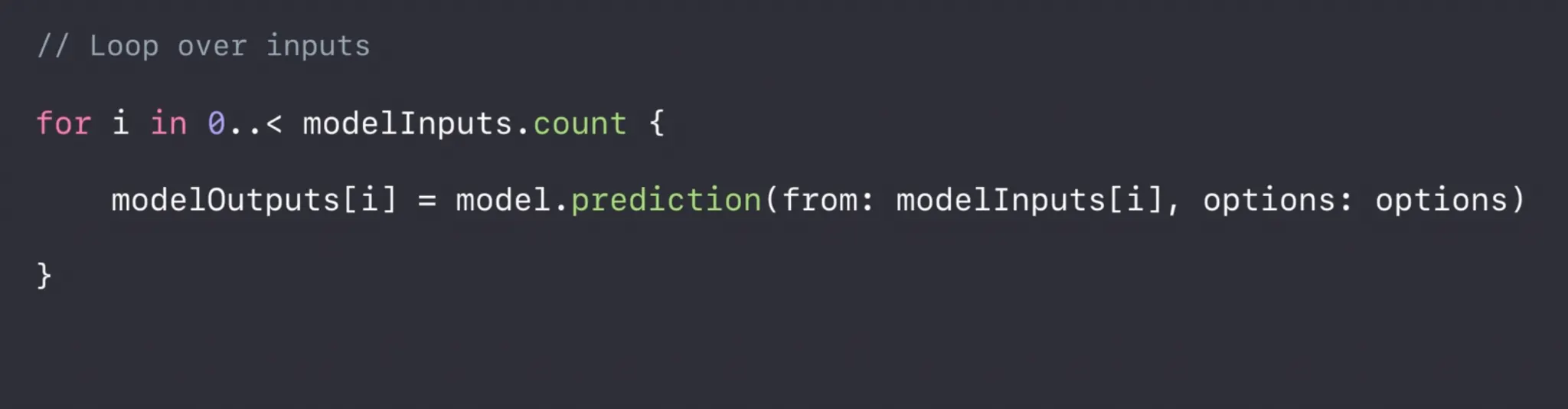 과거에는 이와 같은 워크로드가 있으면 다음과 같은 작업을 수행해야 했습니다. 기존 Core ML 예측 API에 대한 호출을 간단한 for loop으로 마무리했습니다.