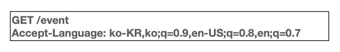 웹 브라우저는 /event 사이트에 들어갑니다. 우선 순위를 매긴 벨류를 넣어서 서버로 보내줍니다. 클라이언트는 한국어로 데이터를 받고 싶지만 안된다면 영어로 데이터를 받고 싶습니다.