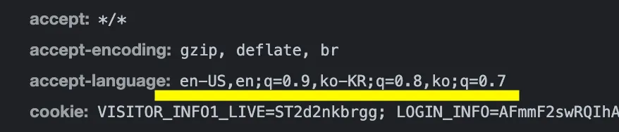 아까 사용하던 Accept-Language 헤더 필드 벨류 값에 우선 순위를 적용했습니다. 0~1 사이의 값을 가지며, 클수록 높은 우선 순위를 가집니다. 우선 순위 값이 생략되어 있다면 1을 가집니다.