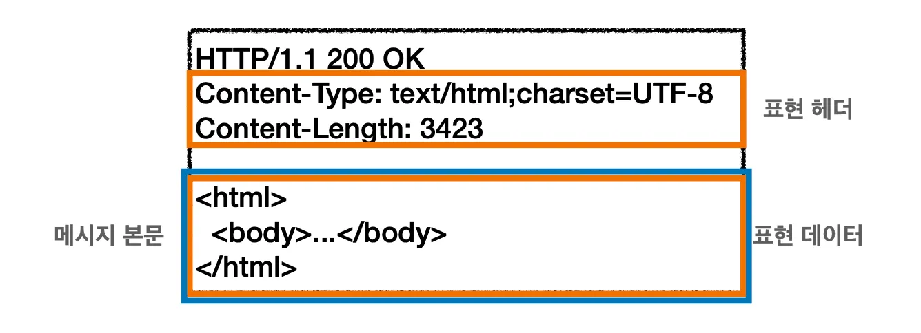 최신 버전에서는 메시지 본문을 통해서 표현 데이터를 전달한다고 합니다. 표현은 요청이나 응답에서 전달할 실제 데이터로, 메시지 본문 안에 포함되어 있습니다.