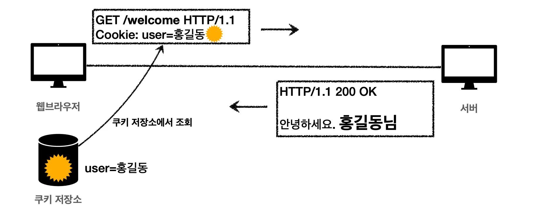 웹 브라우저에서 /welcome 페이지에 접근합니다. 그때 자동으로 Cookie 헤더에 쿠키 저장소에 있는 유저 정보가 추가되어서 서버로 보내집니다.