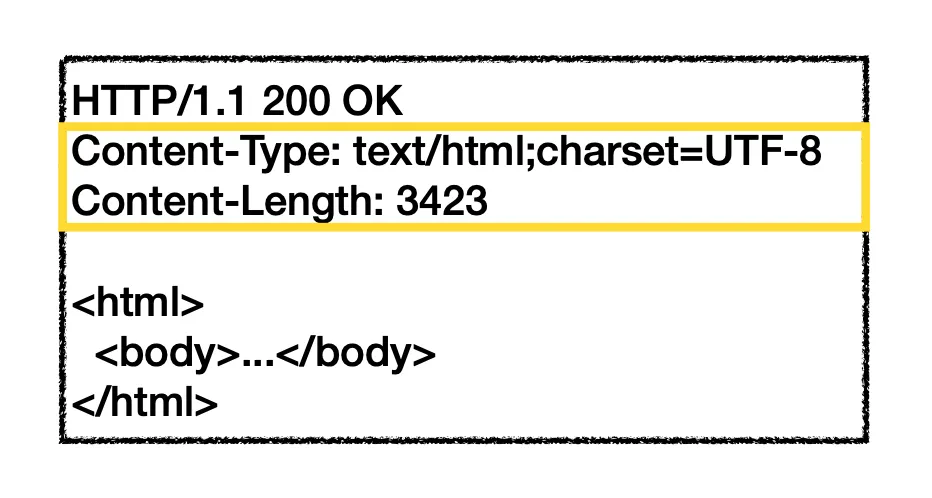 예를 들어서, HTML이 들어간다고 하면 text/html 과 함께 문자 인코딩 관련 정보(charset=UTF-8)가 들어가게 됩니다. JSON 데이터가 들어간다고 하면 application/json이 들어갑니다. JSON 타입은 기본이 UTF-8이기 때문에 따로 인코딩 정보를 적어주지 않아도 됩니다.
