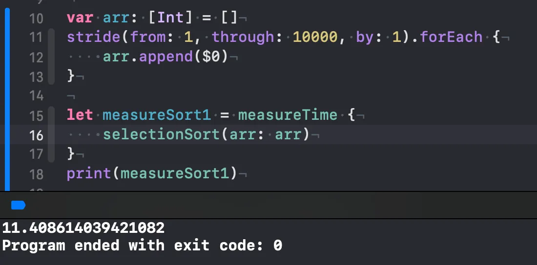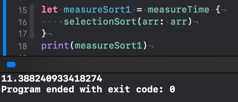 그리고 해당 배열을 선택 정렬과 swift에 있는 sort()로 정렬을 진행했습니다.