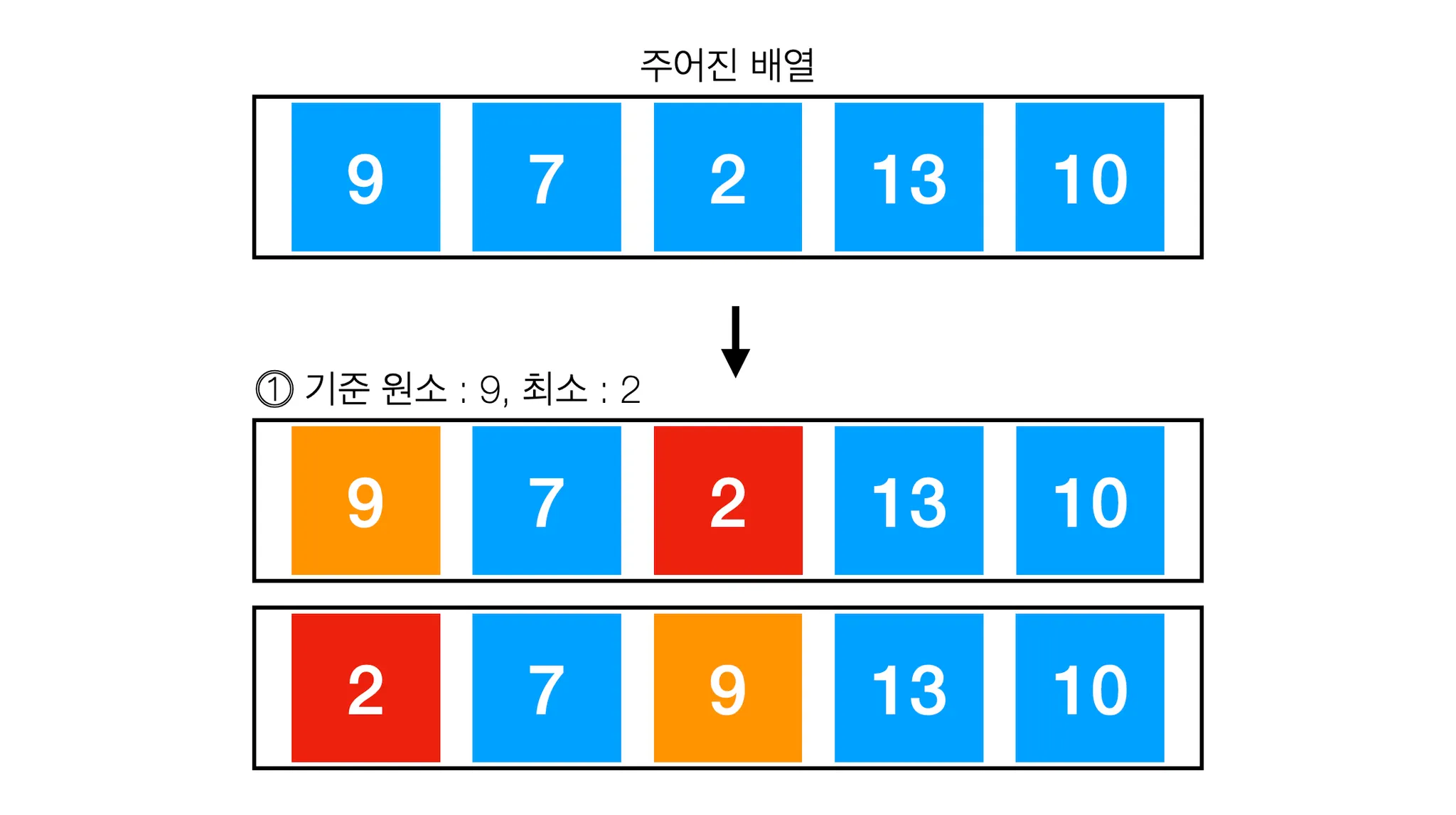 ⓵첫 원소부터 마지막 원소까지 하나씩 기준 원소로 잡고 ⓶기준 원소 다음 원소들 확인하면서 기준 원소보다 작으면 가장 작은 원소로 설정합니다. ⓷다음 원소들 확인 끝나면 기준 원소보다 작은 값이 있는지 확인하고 ⓸있다면 원소를 교환합니다.