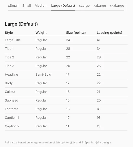 Dynamic Type 은 xSmall, Small, Medium, Large(Default), xLarge, xxLarge, xxxLarge 이렇게 총 7가지 사이즈를 제공합니다.