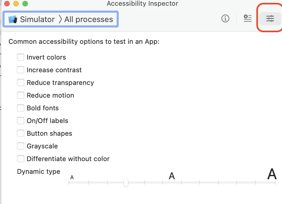 시뮬레이터를 설정해주고 우측 상단의 버튼을 눌러주면 시뮬레이터의 Dynamic Type 을 손쉽게 설정할 수 있어요.