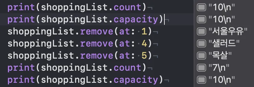 그렇기 때문에, shoppingList에서 요소를 몇개 빼내면 count와 capacity의 값에 차이가 발생합니다.