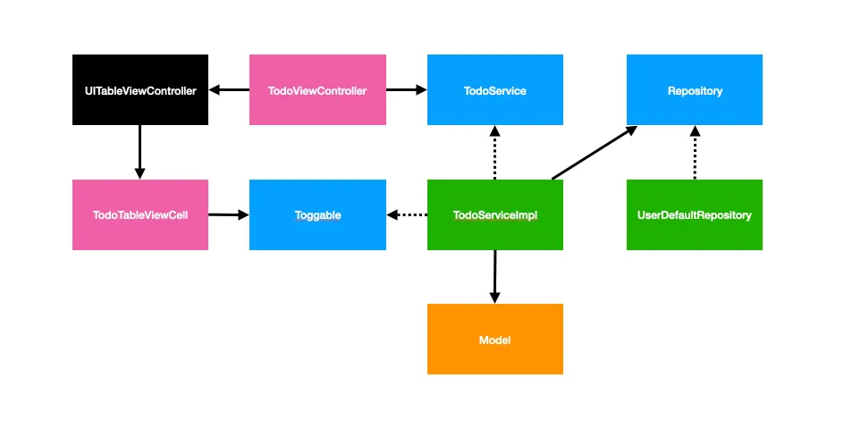 TodoTableViewCell은 Toggable를, TodoViewController는 TodoService를 사용하고 있습니다.