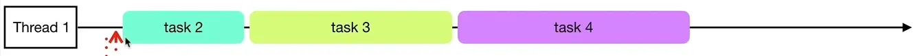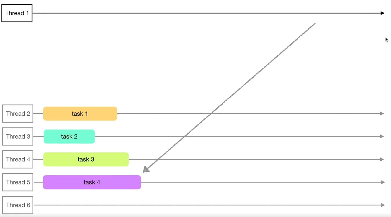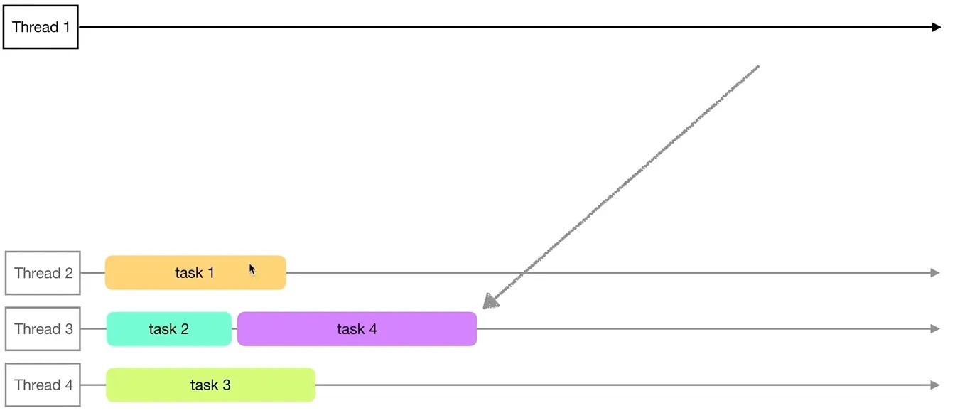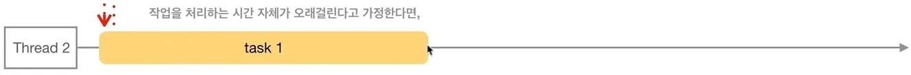 위의 그림에서는 Task 수행 시간이 짧아서 쓰레드 1번에서 여러가지 일을 계속 시켜도 우리는 분산처리를 시켜야겠다고 느끼지 않게 됩니다.