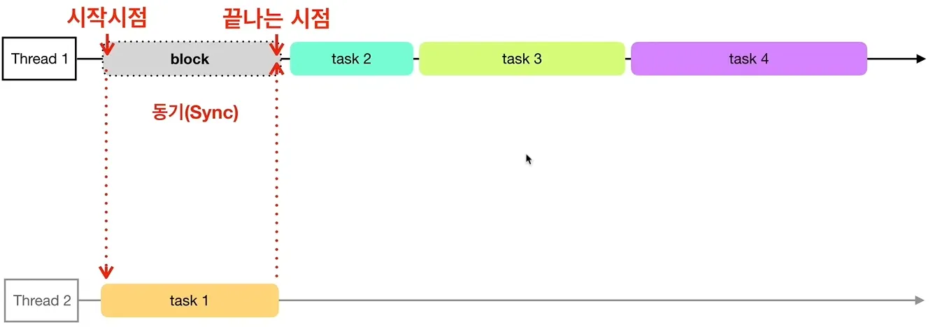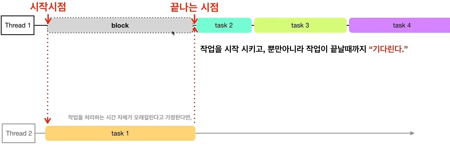 2. 1번 작업이 완료될 때까지 Thread는 블락을 하고서 다른 작업을 하지 못하도록 합니다. |