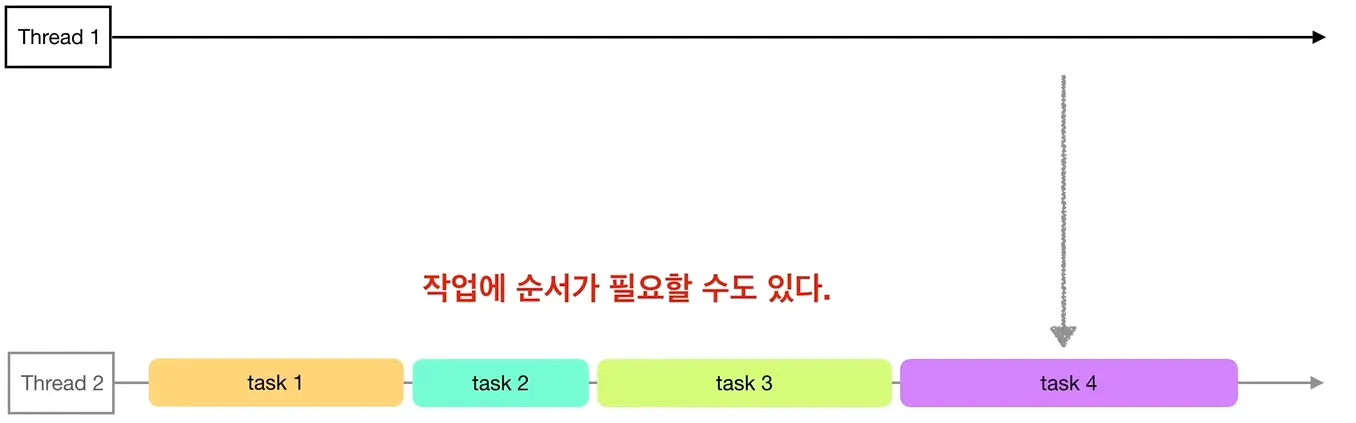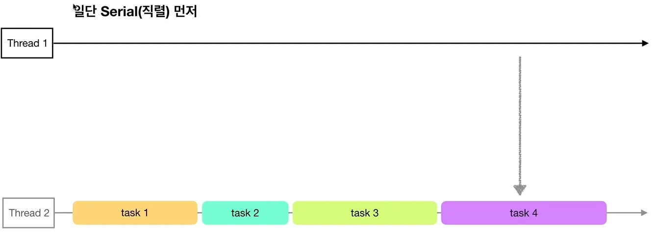 1번 쓰레드에서 하던 작업을 다른 쓰레드로 보내긴 할건데, 다른 하나의 쓰레드로만 보내는 것이 직렬처리