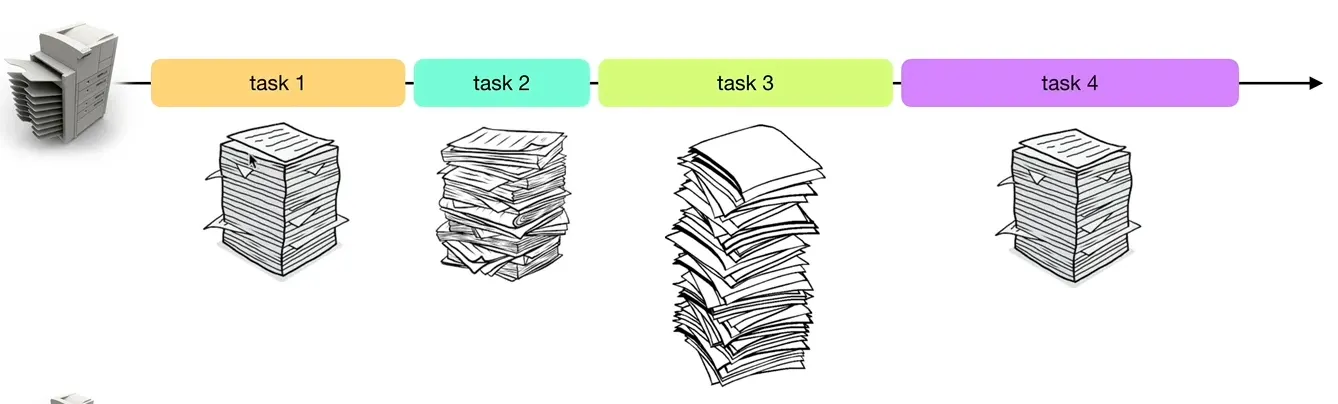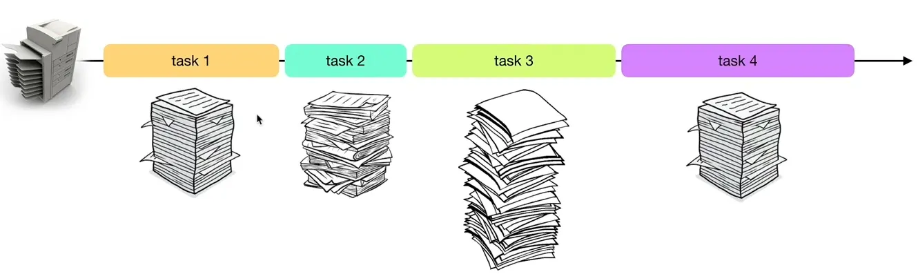 한 대의 복사기는 무진장 힘이 들겁니다. 우리는 다른 작업물을 다른 복사기로 보내서 다른 복사기들도 일을 하도록 처리하고 싶다는 생각이 들기 시작합니다.