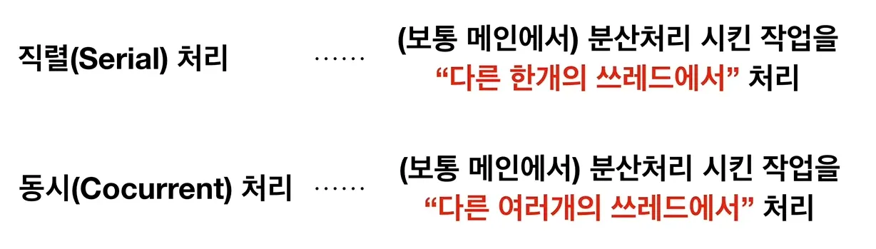 한 개가 아닌 여러 개의 쓰레드로 분산 처리가 이루어 지는 것이 동시처리