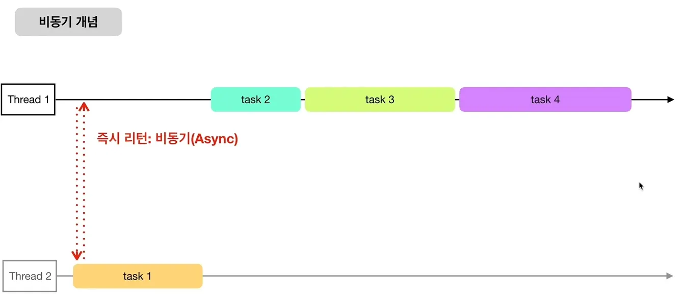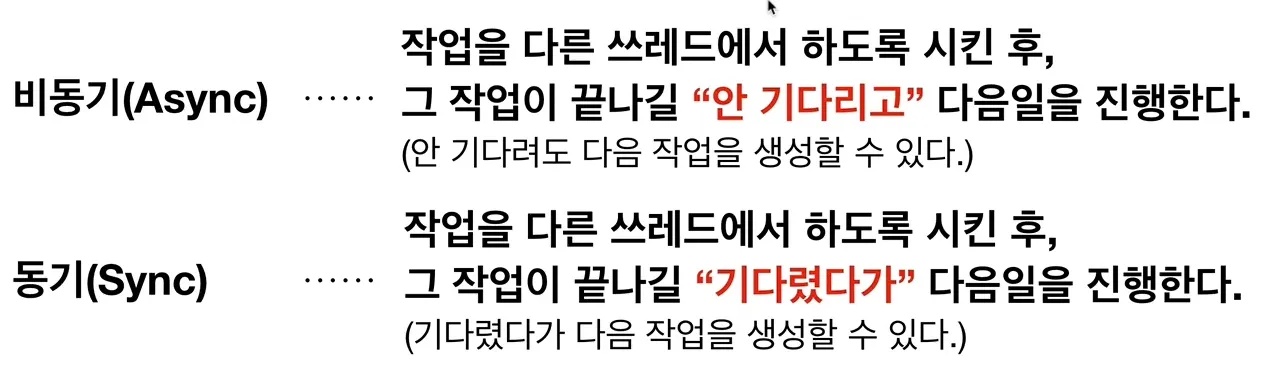 작업을 다른 쓰레드에서 시키고 해당 작업이 끝나는 것을 기다리지 않는 것이 “비동기"입니다.